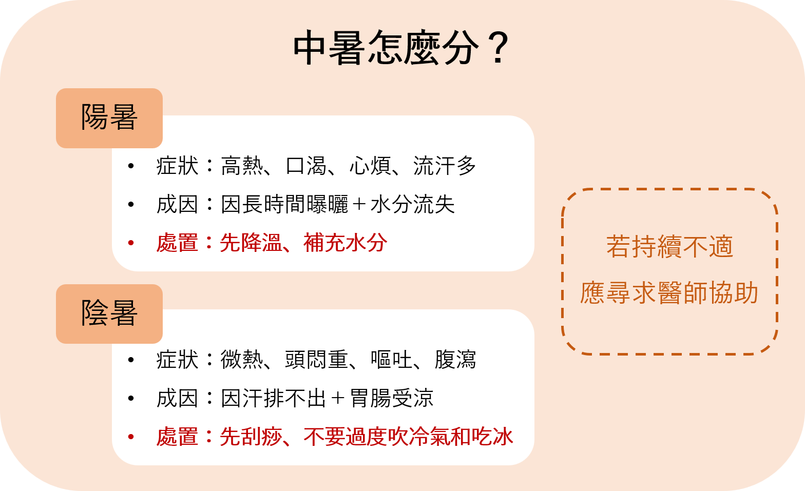 嬰幼兒、老年人、慢性病患、戶外工作者屬於中暑的較高風險族群,在炎熱夏天應該避免長時間曝曬,並隨時補充水分、電解質,另外可適度食用綠豆、薏仁、瓜果等清暑利濕的食物;而如果出現陰暑的症狀,可以先在肩頸後側稍微刮痧,使體內的鬱熱散出。若症狀持續進行,仍應及早尋求醫師協助。